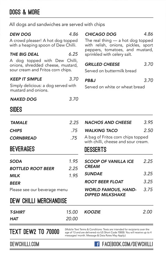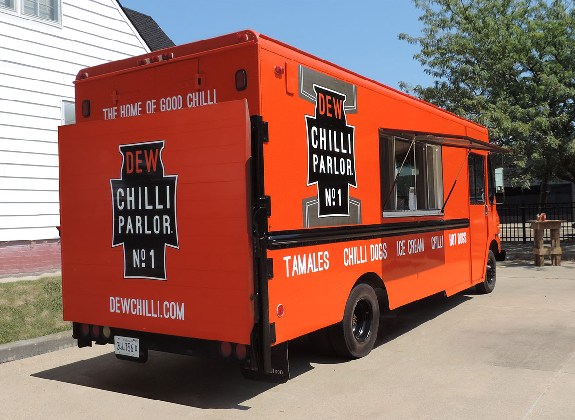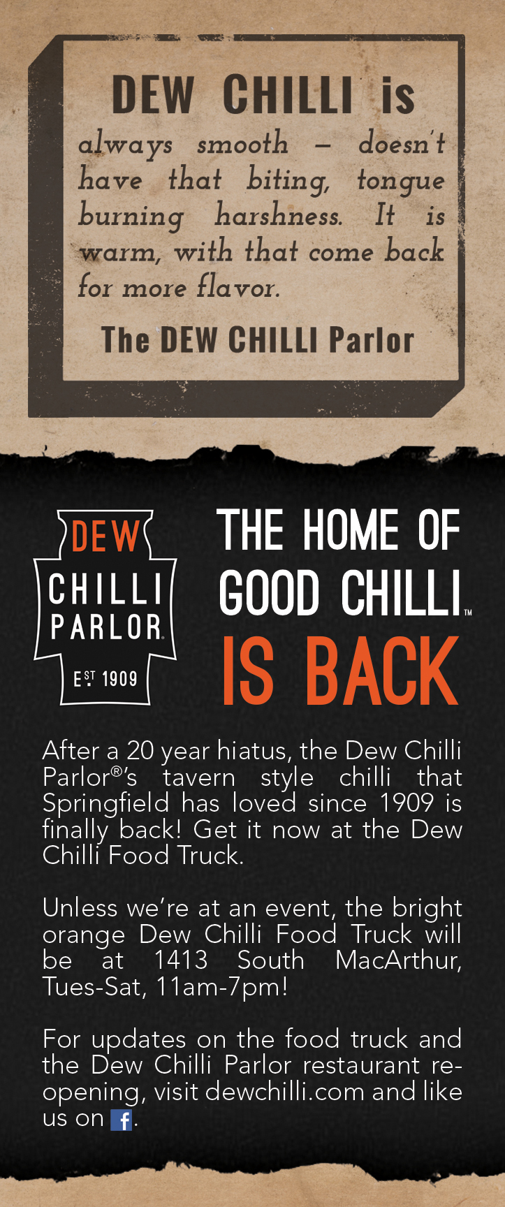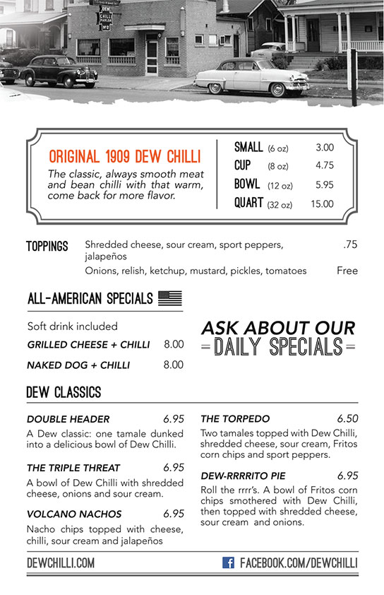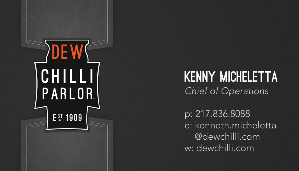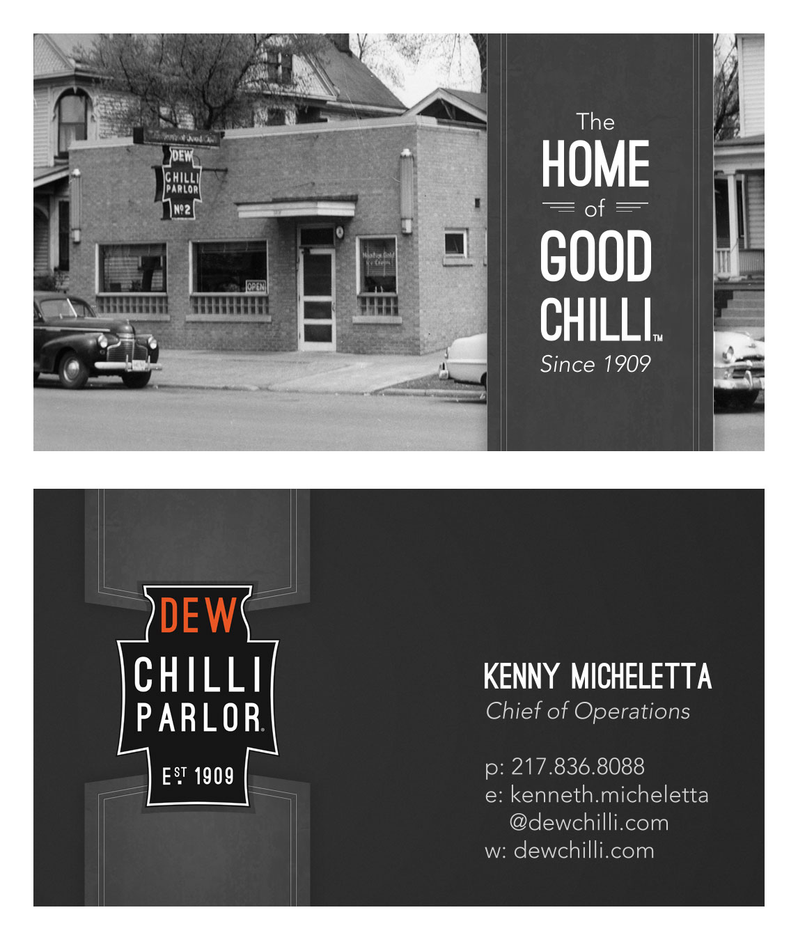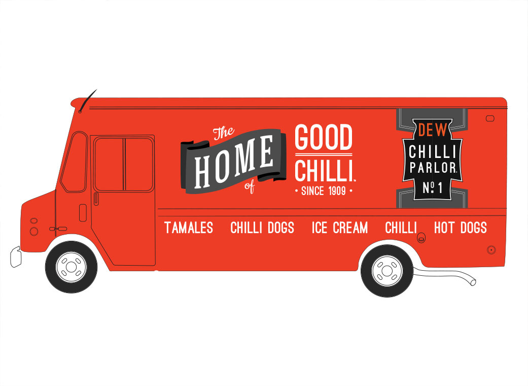 Dew Chilli Parlor logo The Dew Chilli Parlor has served Illinois residents its delicious, mild chilli since 1909. When the restaurant reopened in 2014, it needed complete, new corporate branding from square one. I worked extensively with Dew Chilli, crafting a logo and the branding guidelines that would extend to all of the Parlor's print collateral, web presence, social media and advertisements, including the designs for a food truck and the menu located at the brick and mortar restaurant. The branding I created for Dew Chilli focused on modernizing the long history of the Parlor and making it both contemporary and vintage.